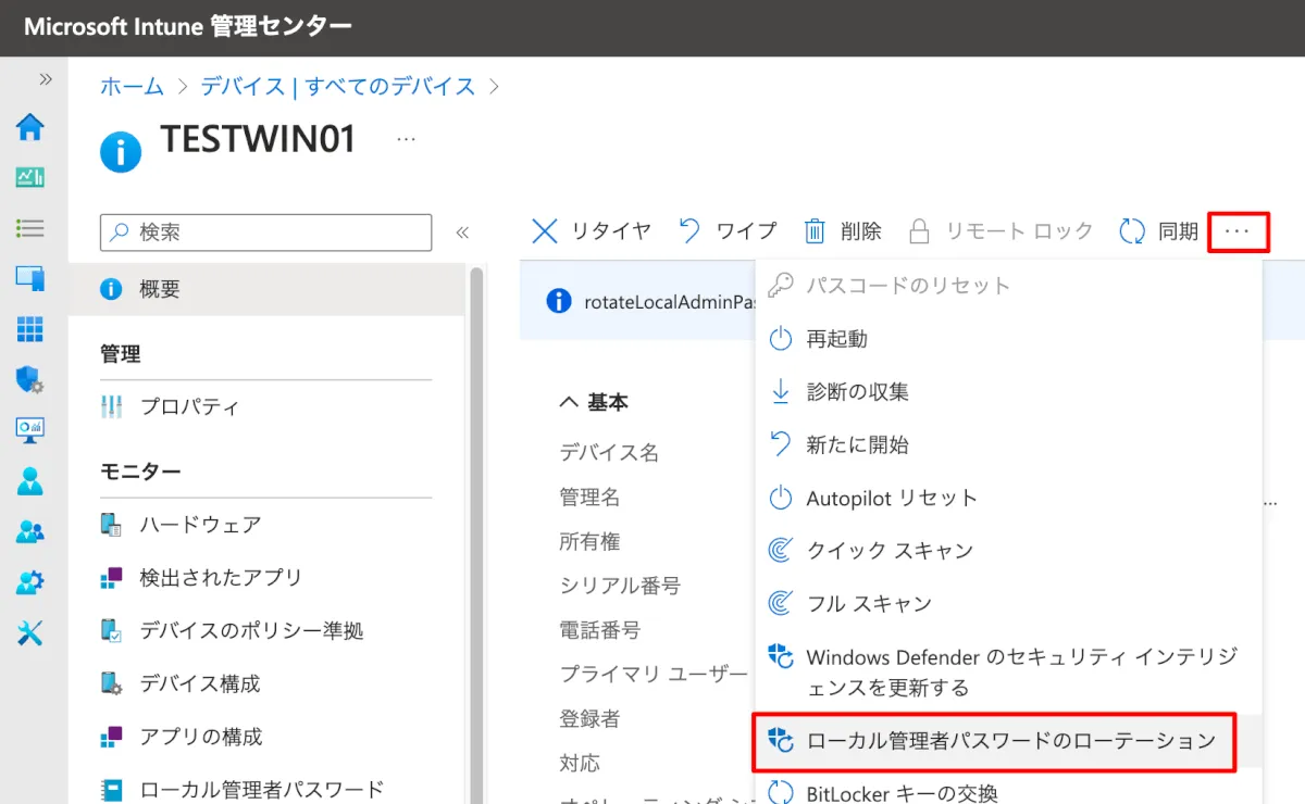Microsoft Intune 管理センターから各端末の [概要] > […] > [ローカル管理者パスワードのローテーション] からリモートでリセットできます。