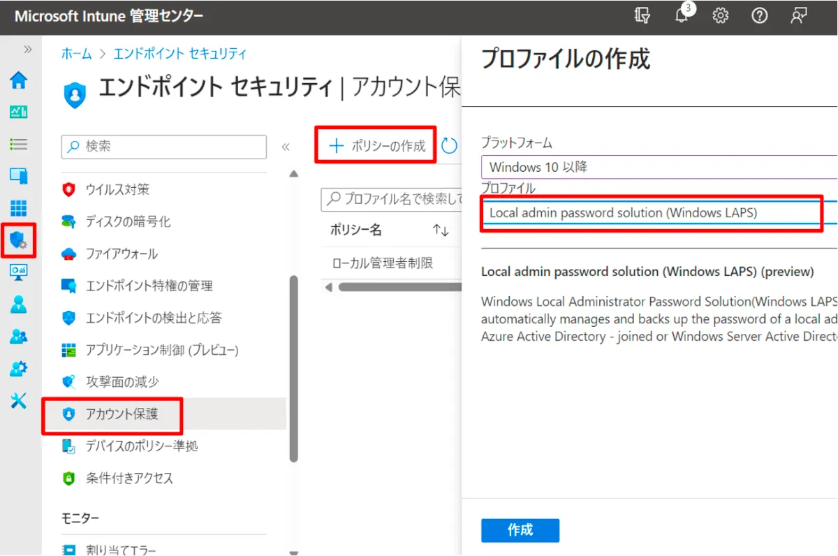② 左メニューより [エンドポイント セキュリティ] > [アカウント保護] > [+ ポリシーの作成] > [Local Admin password solution (Windows LAPS)] を選択して作成します。