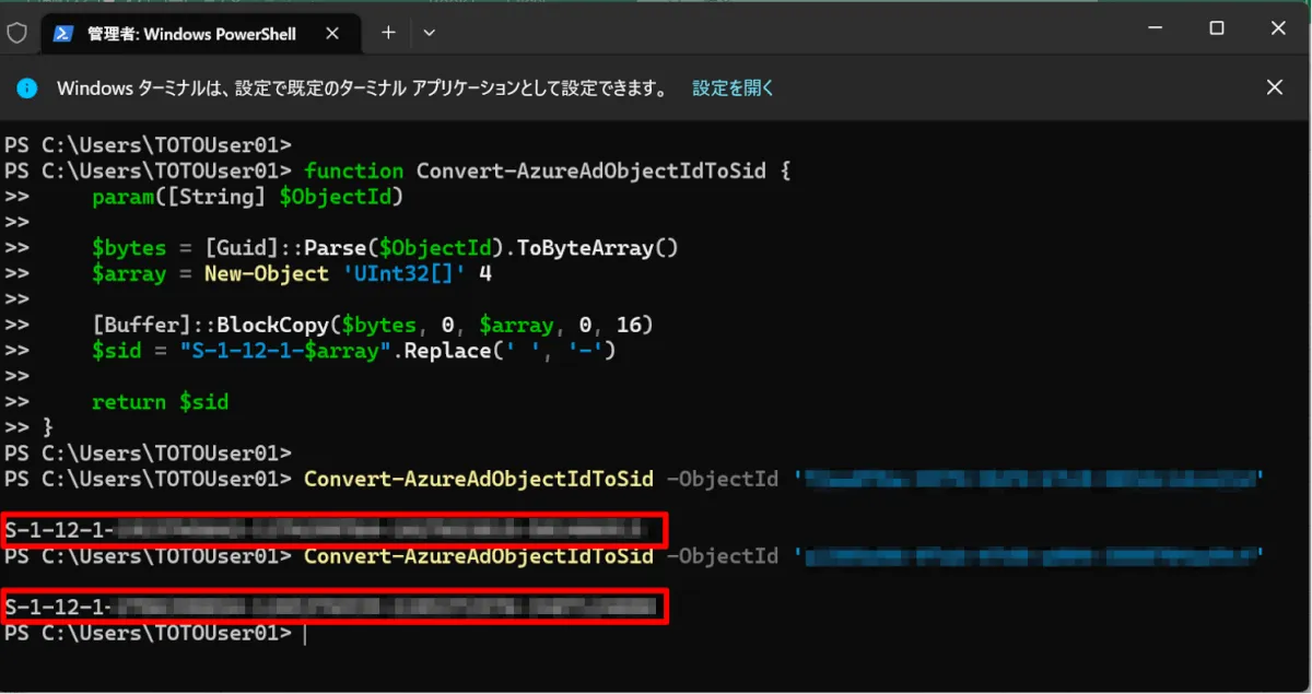 Convert-AzureAdObjectIdToSid -ObjectId '<グローバル管理者の ID>'