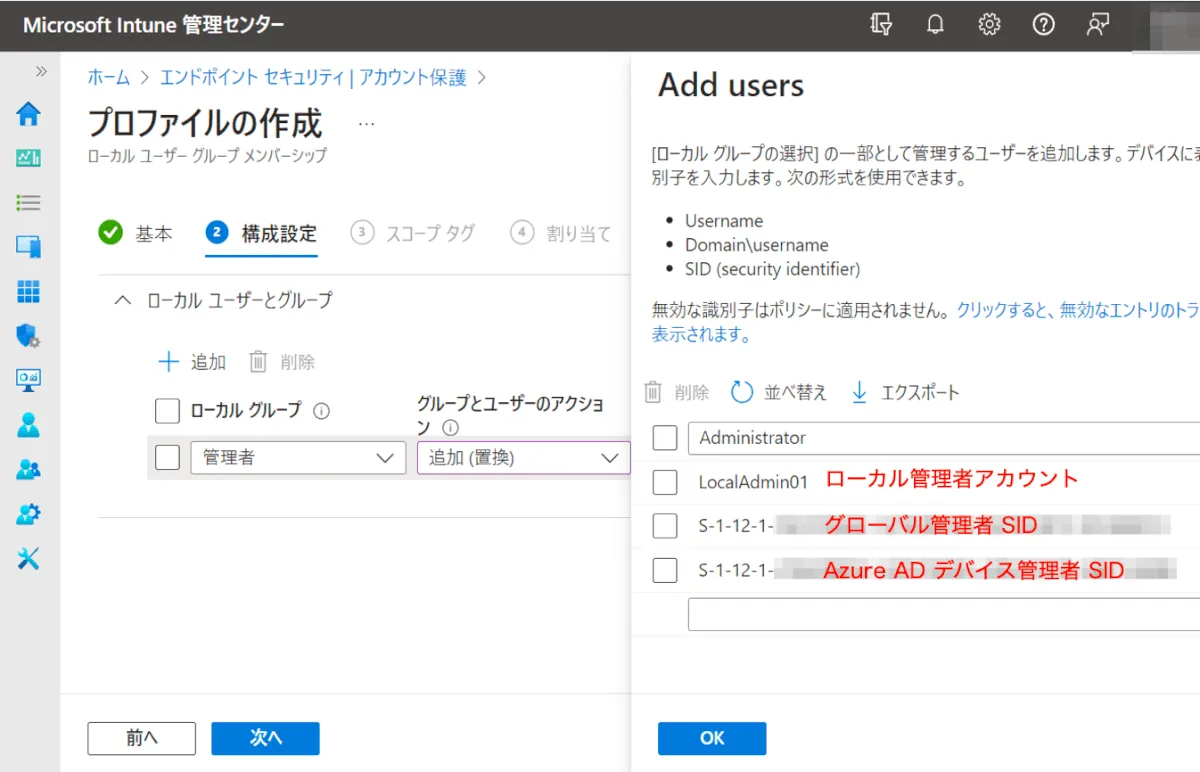 Intune のアカウント保護ポリシーで管理者としたいアカウント Administrators グループに追加。ついでに既存端末でローカル管理者権限が付与されてしまっているユーザーから権限を削除したい場合も。こちらも不要の人はスキップして良い構成。