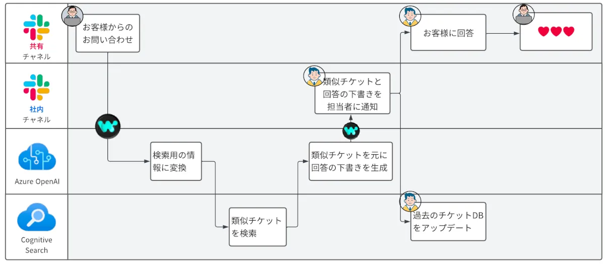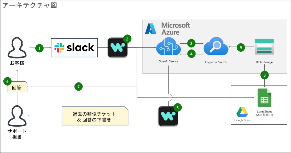 - 今回、Azure OpenAI Service と過去3000件の顧客対応記録を使って「過去の類似チケット」と「回答の下書き」を自動生成するようにシステムを構築しました。