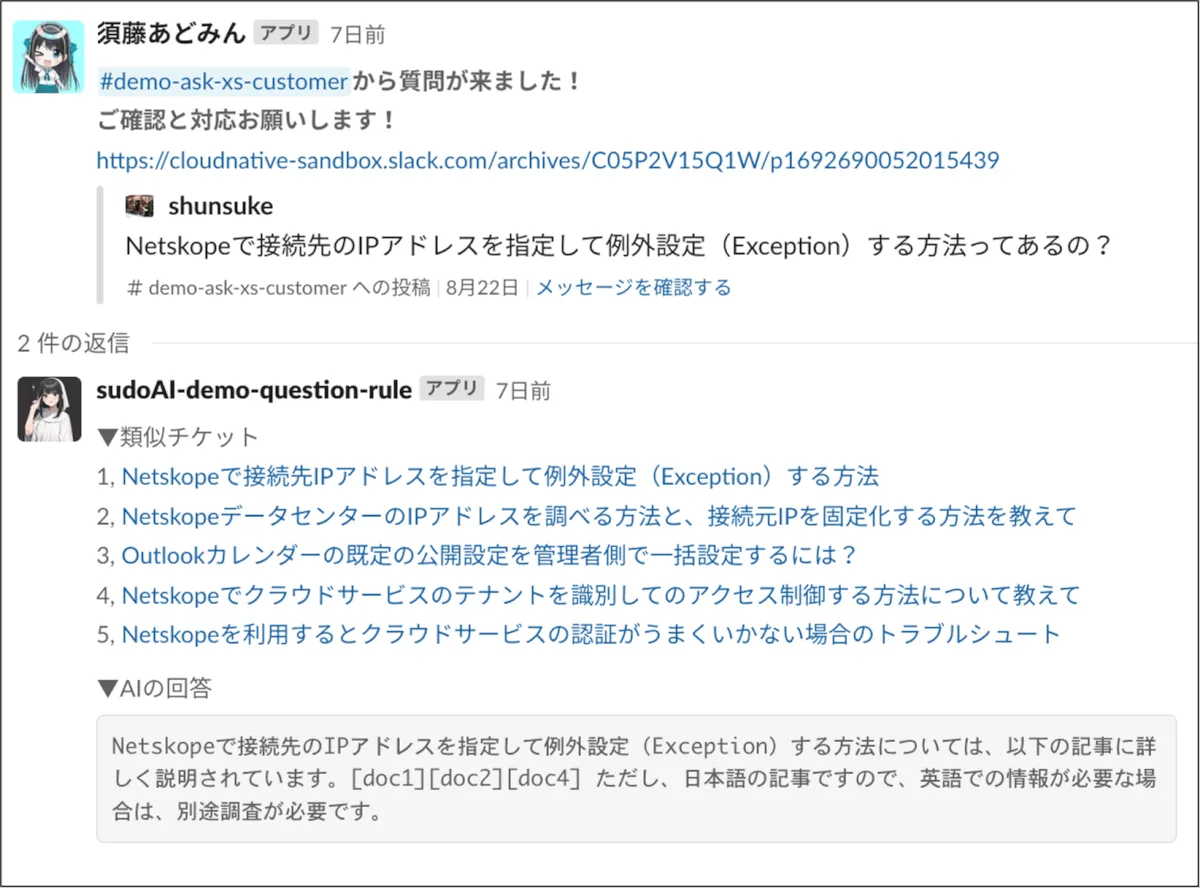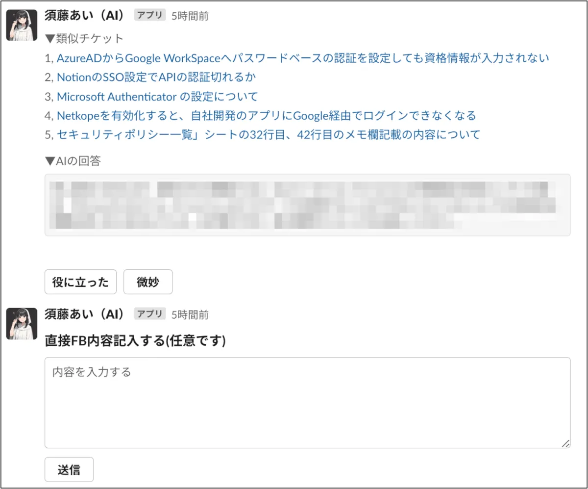 - 全く同じ質問が来ることは稀であるが、3回に1回ぐらいのペースで「対応に参考となるチケット」が表示されるため、その投稿を参考にしながら対応を行うことができる。(3回に1回でも超嬉しいというフィードバックあり)