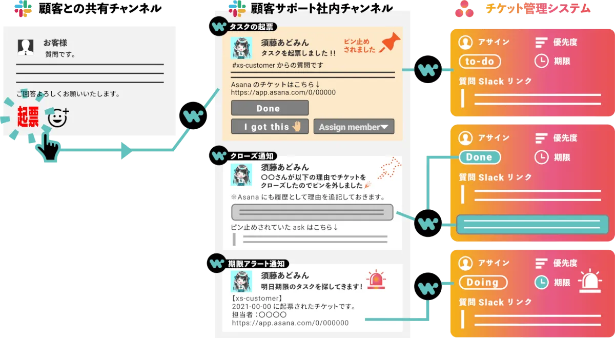 一方、当社側ではSlackで質問された投稿に対して「起票しました」スタンプを押します。すると、iPaaS(Workato)がタスク管理システムにチケットを自動で作成し、社内の顧客サポート専用チャンネルに通知します。その後、その質問に回答するために最も適切なメンバーがアサインされ、質問に対して回答を行います。また、エンジニアが立候補して対応することもあります。