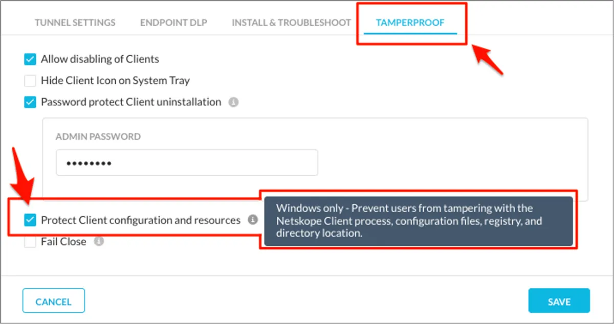 NetskopeのClient Configuration内の「Protect Client configuration and resources」はNetskopeのプロセスの停止を防いだり、フォルダ、ファイル、レジストリキーを改ざんできないように保護する機能です。