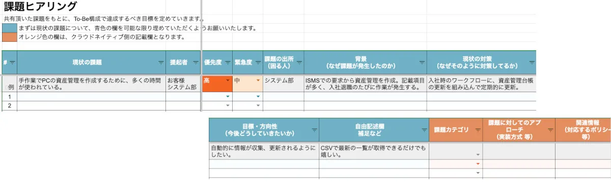- リストに沿ってお客様の課題や、優先度・緊急度、背景、現状の対策、どうしていきたいか(目標や方向性)などを記入いただく。