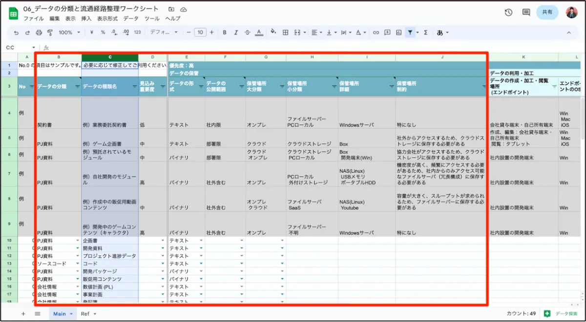 - クラウドネイティブが用意した「データの分類と流通経路ワークシート」を、記入ガイドに沿って埋めていただく。