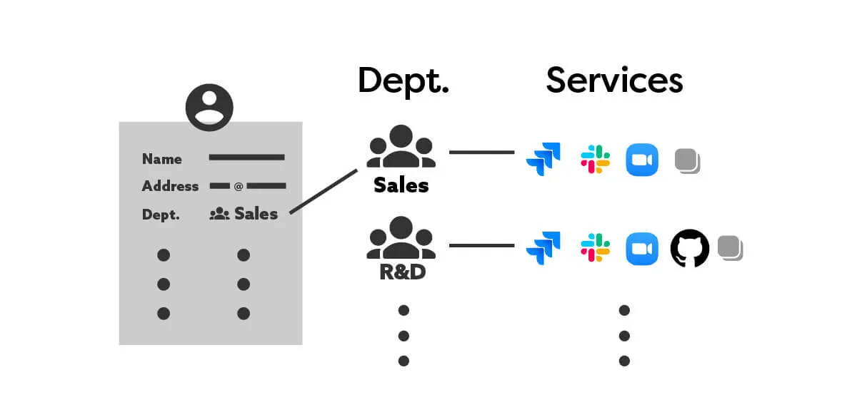 IDaaSにあるグループ機能を利用することでユーザーの属性ごとに自動的にグループ化をし、SaaSへの割り当てを行うことができます。例えば営業部門所属のユーザーは必ずSalesforceに、開発部門所属のユーザーは必ずJIRAを利用するような場合はIDaaS内で部署グループを作成しておきSaaSと紐づけておきます。ユーザーの属性によって自動的に部署グループに割り振りを行うことで結果としてグループに紐づいたSaaSの利用を許可したり、Provisioning対応SaaSであればアカウント発行までをまとめて行うことができます。
