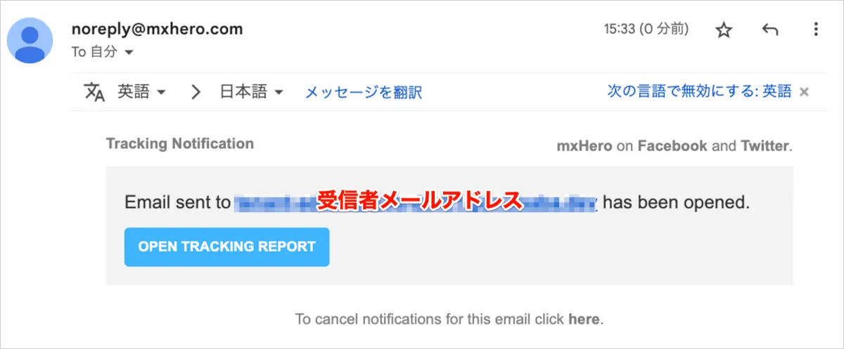 メール送信者へ送信メールの返信としてmxHERO(noreply@mxhero.com)から以下の通知メールが初回の1度だけ届きます