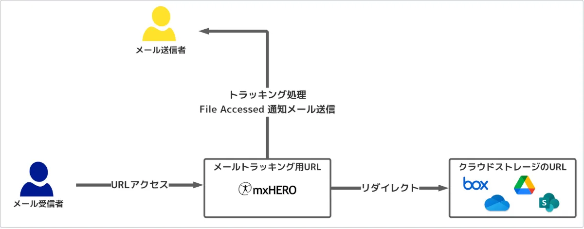 - 共有リンクへアクセスした際のトラッキング(File Opened)が検知するのはあくまでも「services.mxhero.com」へのアクセスとなり、クラウドストレージへの直接のアクセスではない