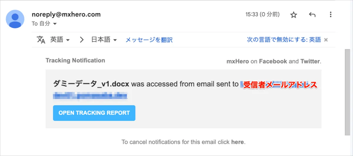 メール送信者へ送信メールの返信としてmxHERO(noreply@mxhero.com)から以下の通知メールが初回の閲覧とダウンロードで1度ずつ届きます