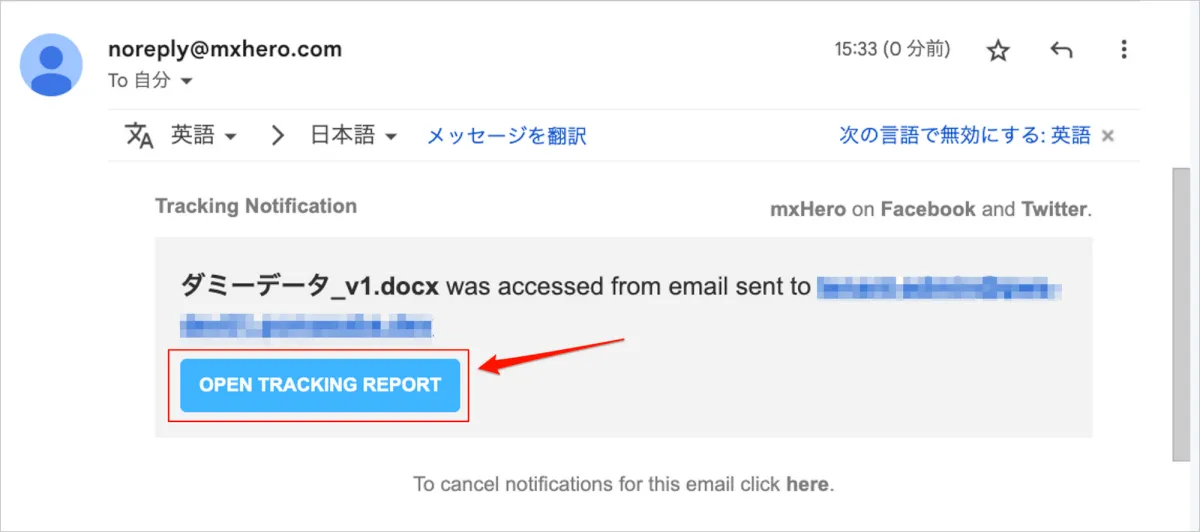 - 通知メールに付与されている「OPEN TRACKING REPORT」を開くことで詳細なトラッキング状況を確認できます。レポートには以下の情報を確認できます。