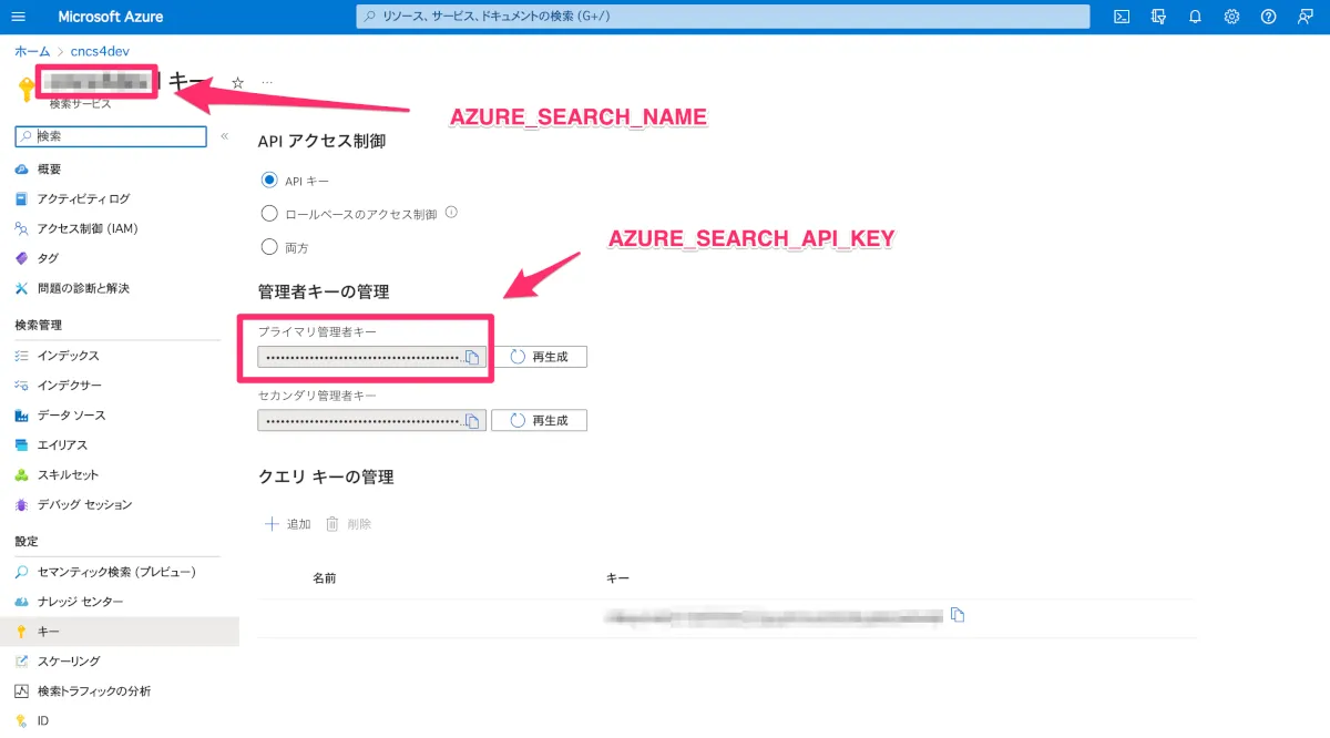 Azure Cognitive Searchの作成し、 AZURE_SEARCH_API_KEY, AZURE_SEARCH_NAME, AZURE_SEARCH_INDEX_NAME, AZURE_SEARCH_API_VERSION の取得