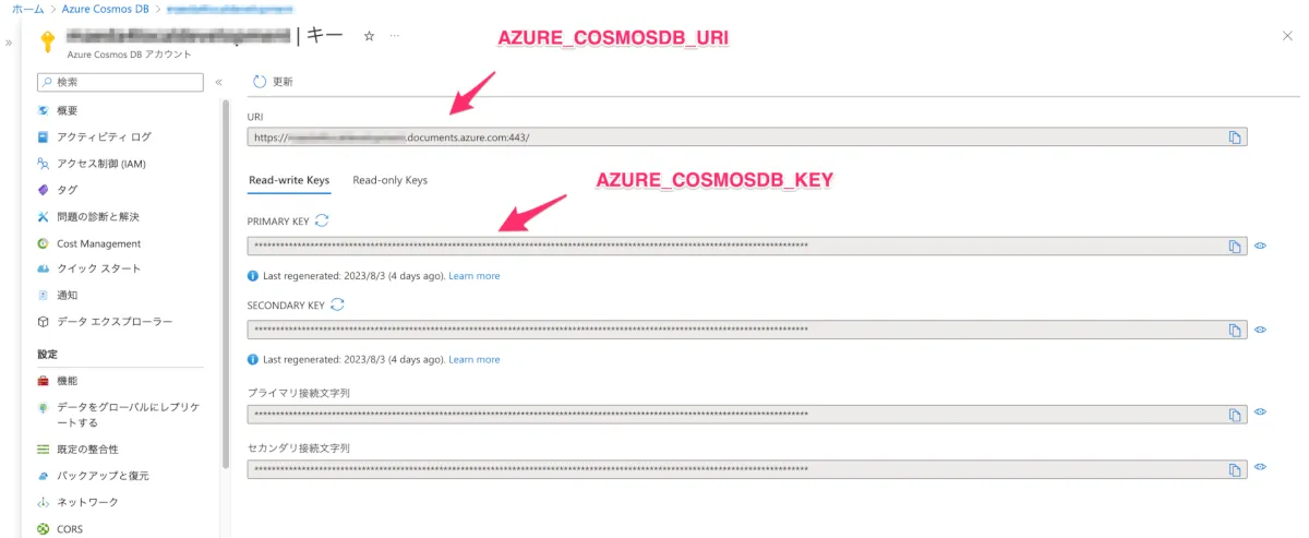 Azure Cosmos DBでインスタンスの作成し、 AZURE_COSMOSDB_URI と AZURE_COSMOSDB_KEY の取得
