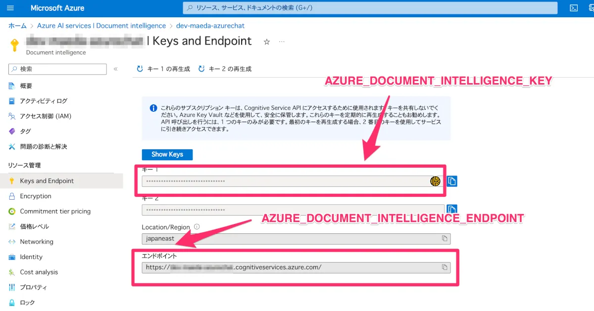 Document Intelligenceの作成し、 AZURE_DOCUMENT_INTELLIGENCE_ENDPOINT, AZURE_DOCUMENT_INTELLIGENCE_KEY の取得