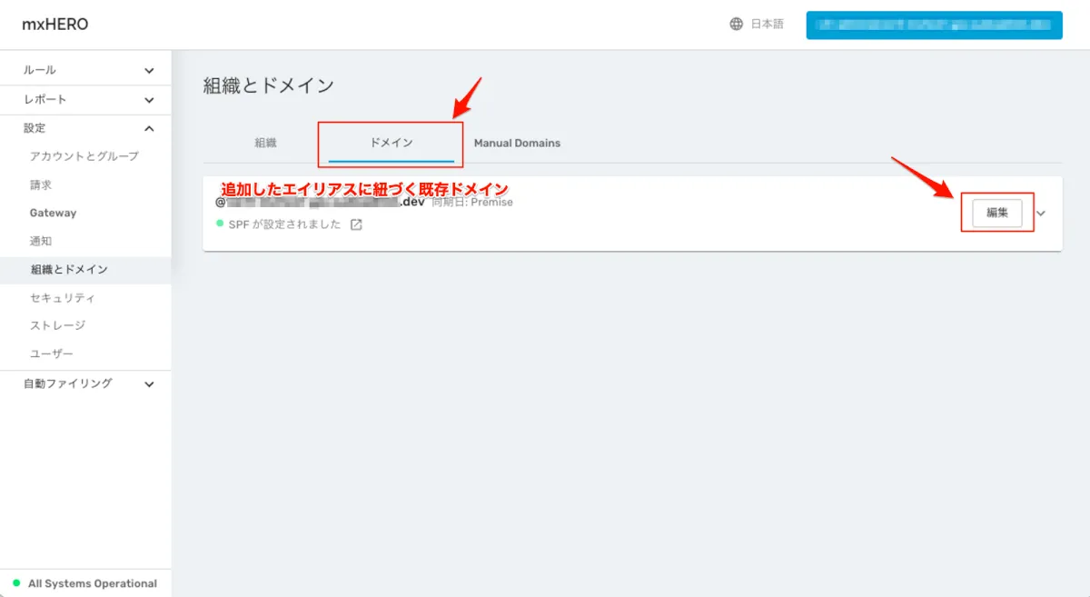 - エイリアスドメインに紐づいているドメインの「編集」を選択します