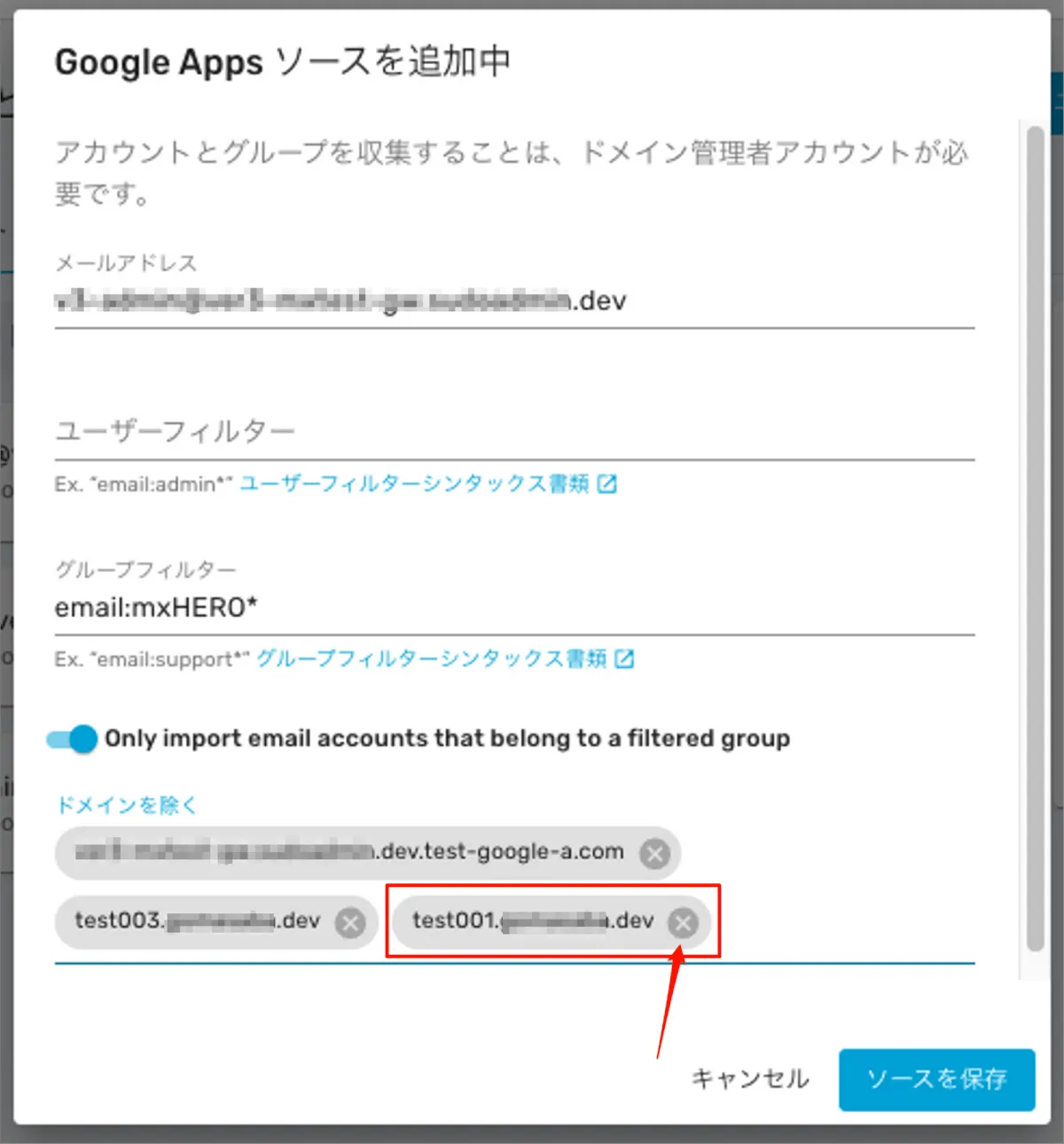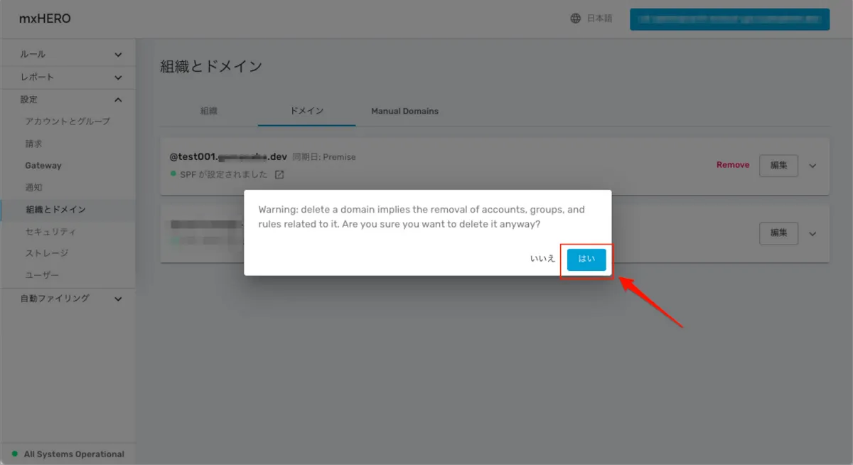 - mxHERO側で同期処理を行い、対象のドメインが管理外の警告が出ないことを確認する