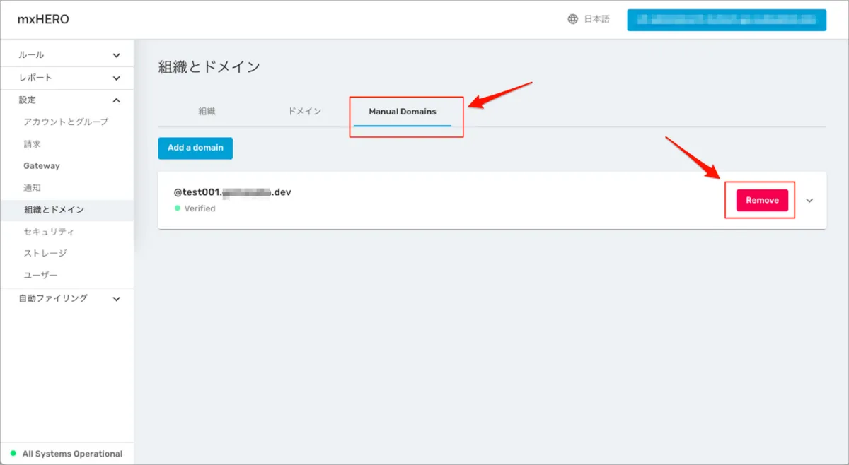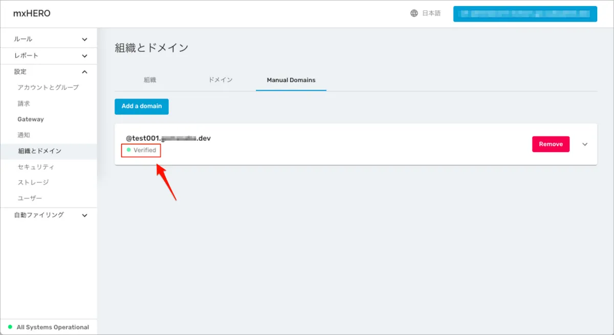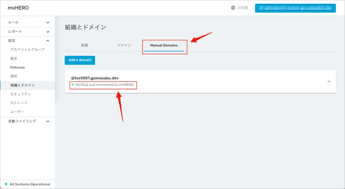 - 「Manual Domains」タブに戻ると、該当の追加ドメインは「Verified and Connected to mxHERO」状態になっていることがわかります
