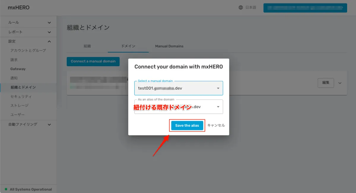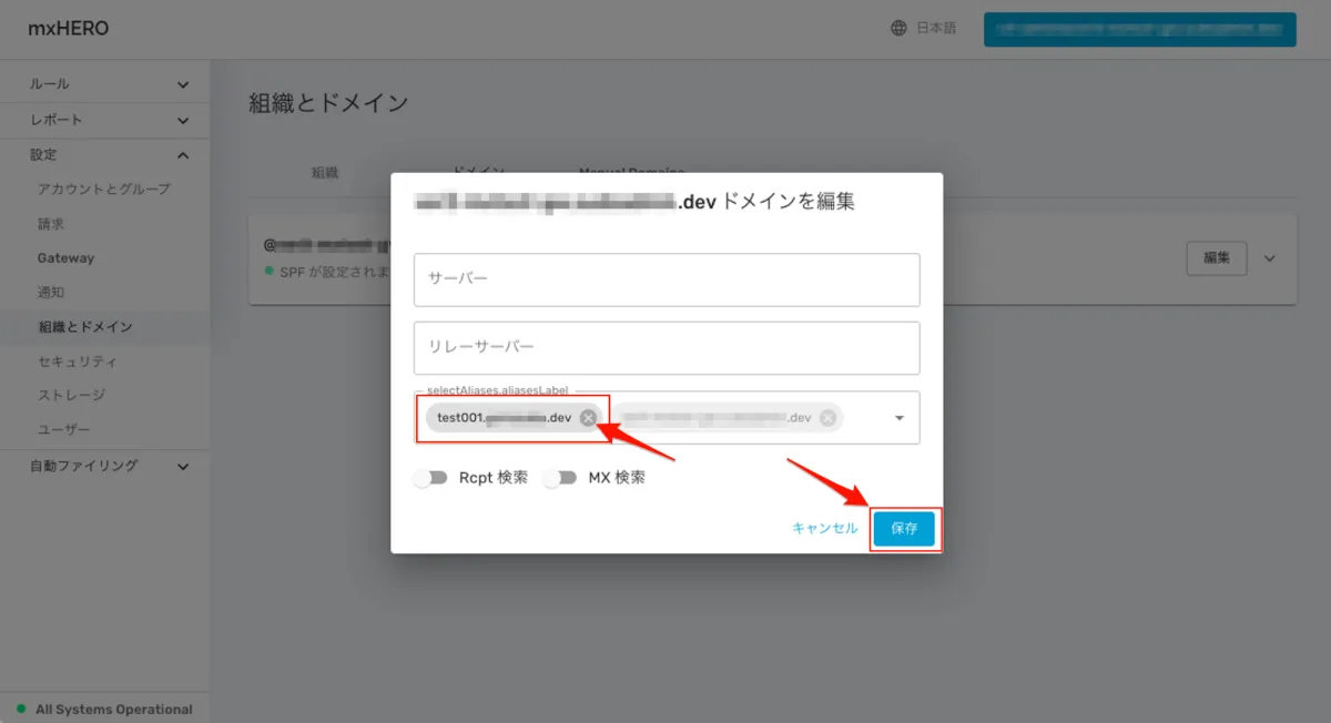 - 紐づいている既存ドメインのエイリアスドメインとして✖️マークで削除し、保存します