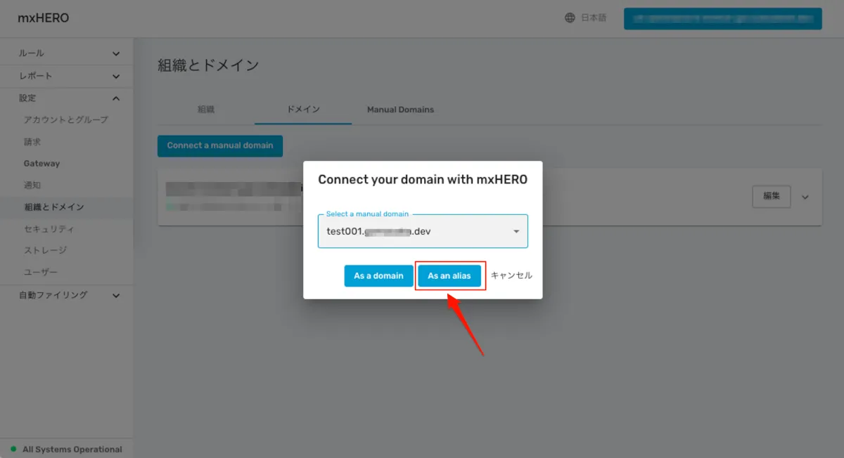 - どちらを選択するかはメールシステム側でセカンダリドメイン、エイリアスドメインのどちらで利用する設定したかに合わせてmxHERO側も選択します