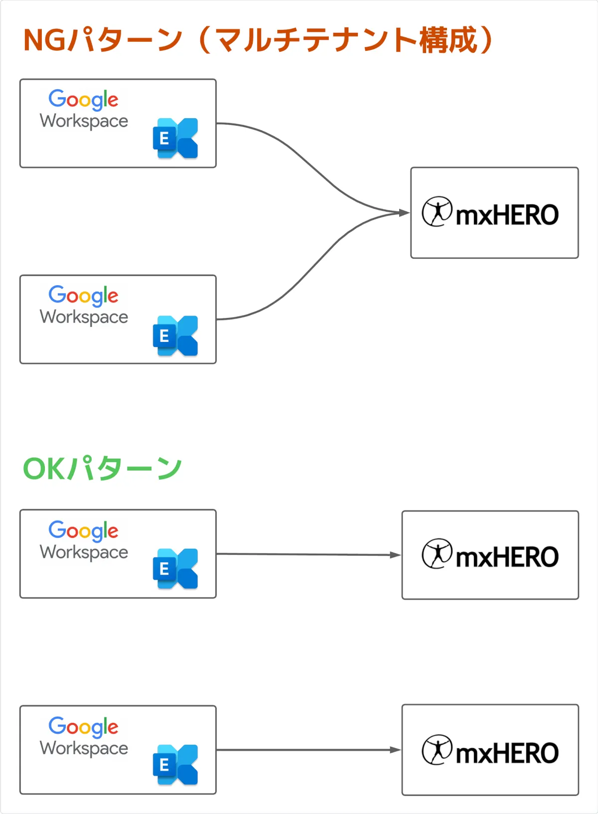 - つまり、複数テナントのメールシステムを1つのmxHEROテナントへ接続するマルチ「テナント」構成の目的では利用しないでください