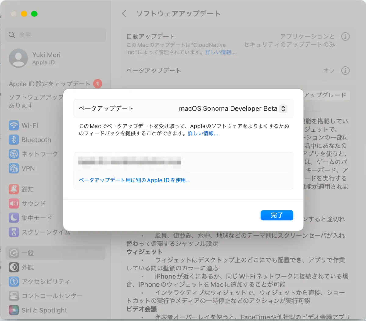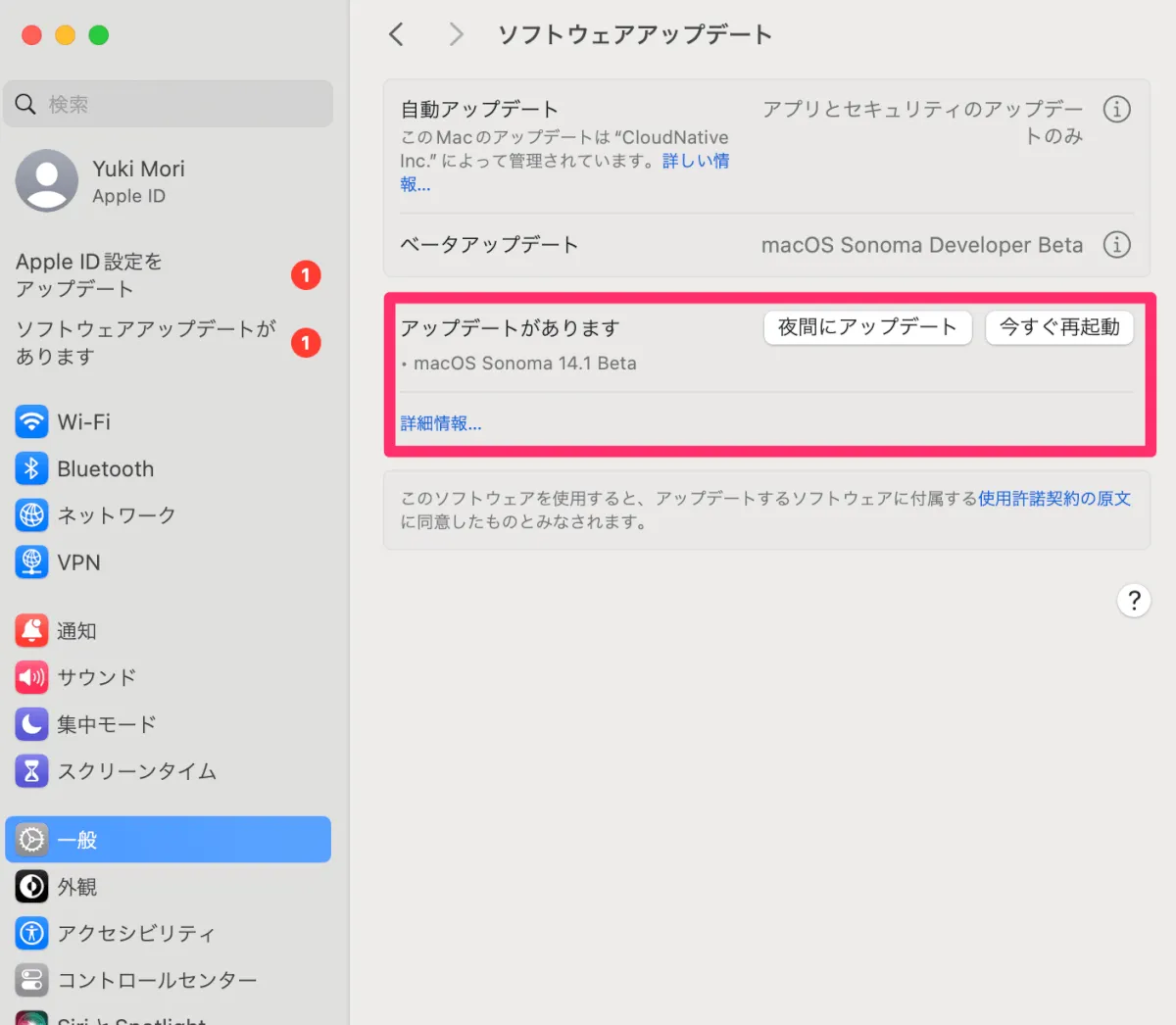 ※ 私がアップデートした際(9/27時点)はmacOS Sonoma 14.0でしたが、執筆時点(9/28)ではmacOS Sonoma14.1 Betaがリリースされていました。非常に動きが速いですね。