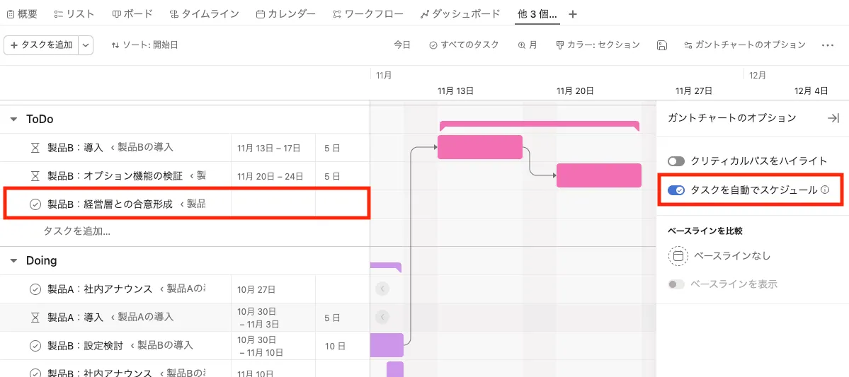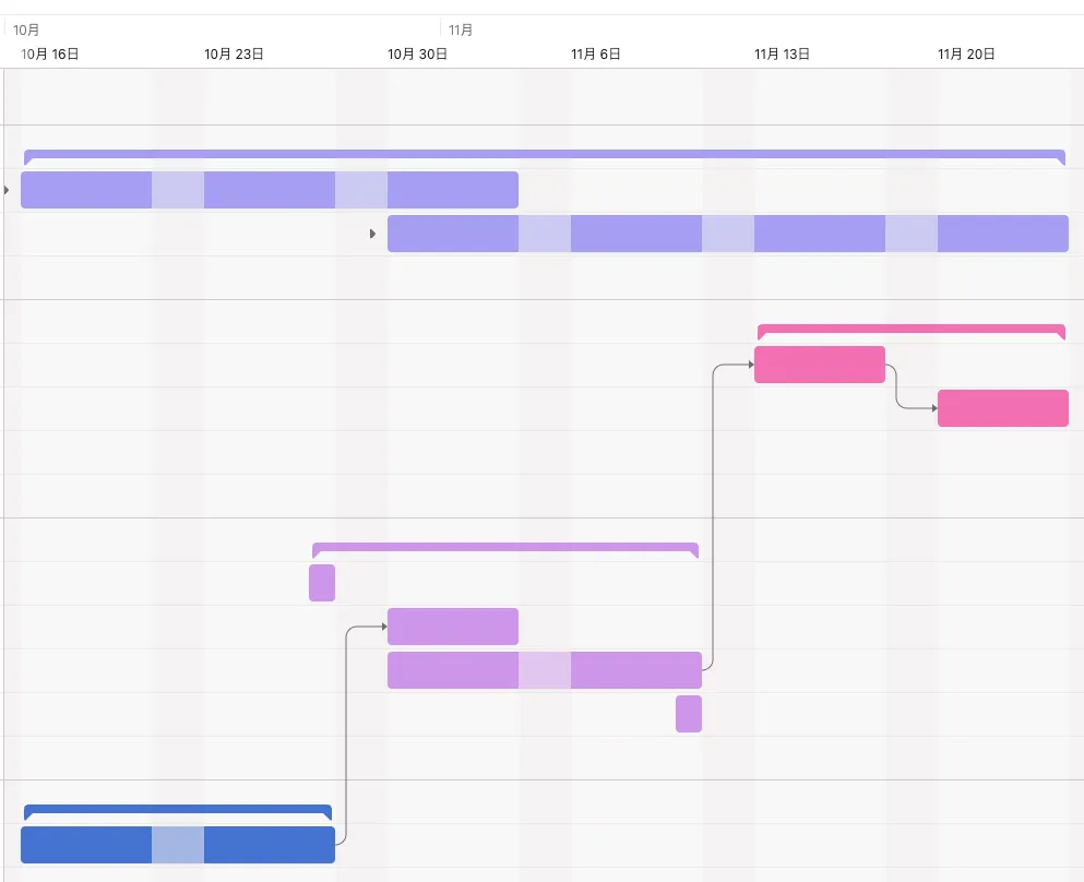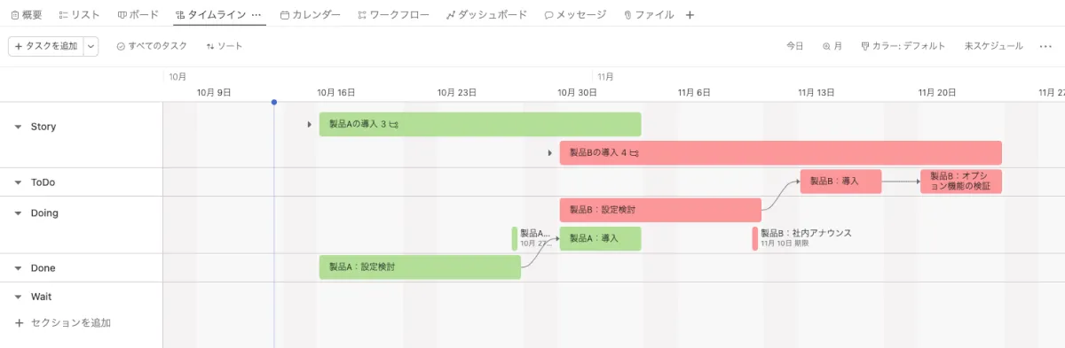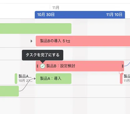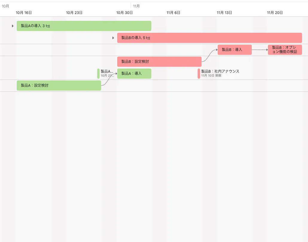逆にガントチャートができないこととしては、1行に複数タスクを配置することはできなくなっています。これができるタイムラインでは、連続するタスクを視覚的に表現しやすくなります。
