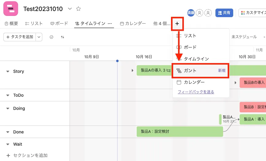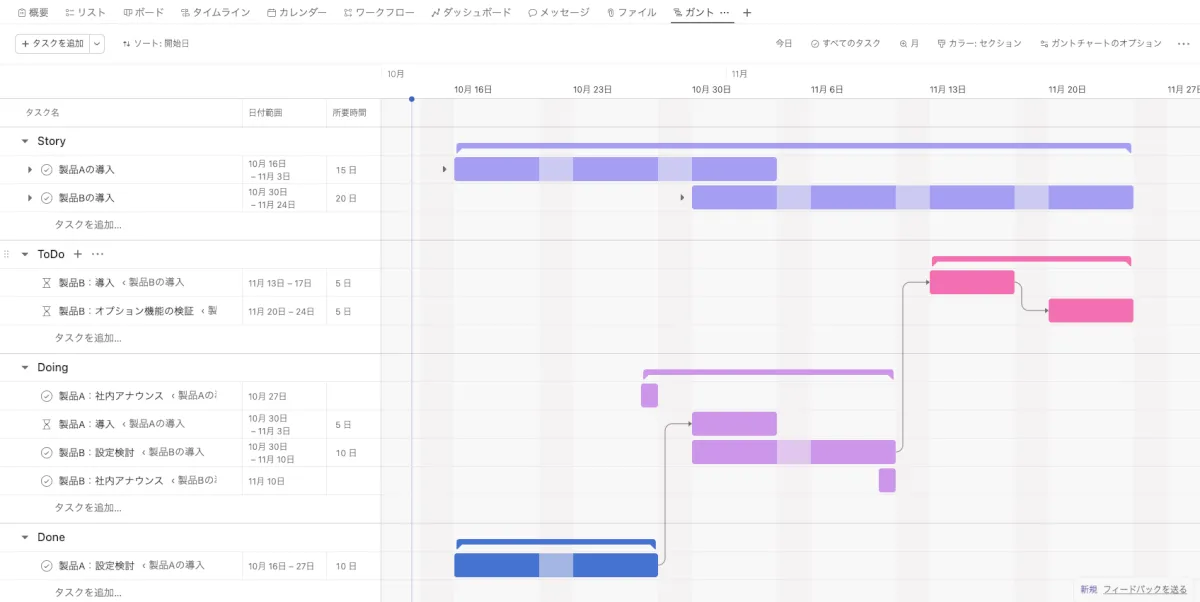 これでこれまで作成したボードの内容が反映された、ガントチャートが表示されます。
