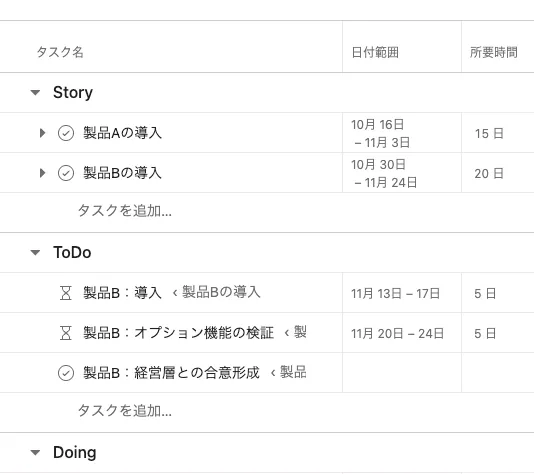 比較した違いとしては、タスク名・タスク期限が左端に一覧表として表示されていることがあります。一般的なガントチャートとしておなじみの表示ですが、タイムラインにはありませんでした。後の章で言及しますが、この左端の表示が非常に強力です。