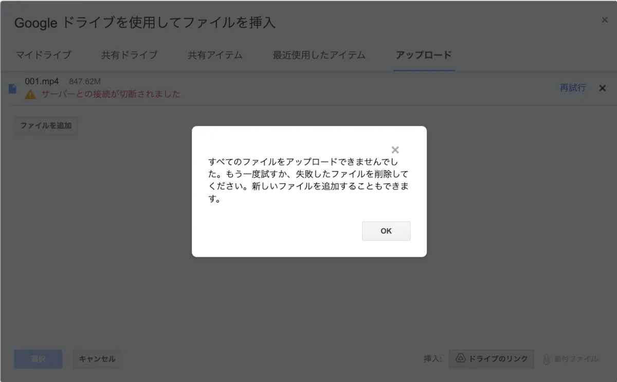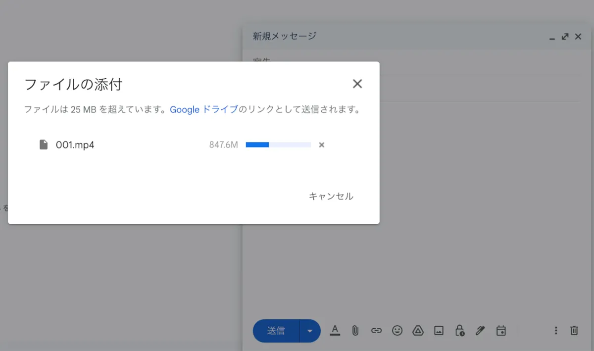 - 1)25MB以上のファイルを添付しようとするとマイドライブへのアップロードが開始する