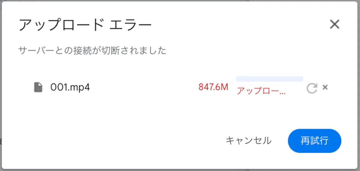 - 途中までアップロードは進みますが、最後の書き込みのでエラーとなる