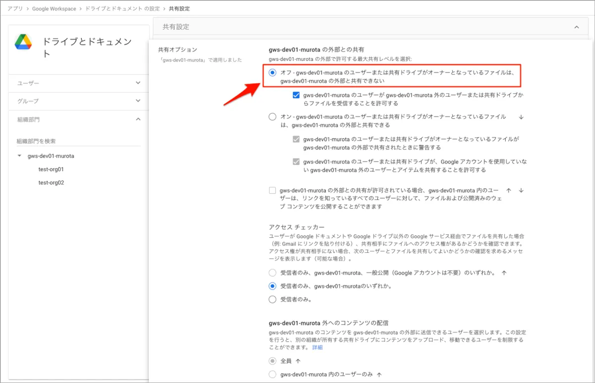 以下の設定箇所でマイドライブからは組織外への共有を制限します。