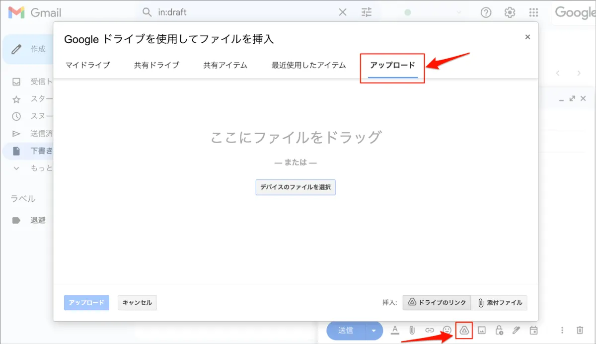 しかし、25MB以上のファイルを添付しようとするとGoogle Driveのマイドライブへ自動的にアップロードし、共有リンクに置き換える機能を持っています。