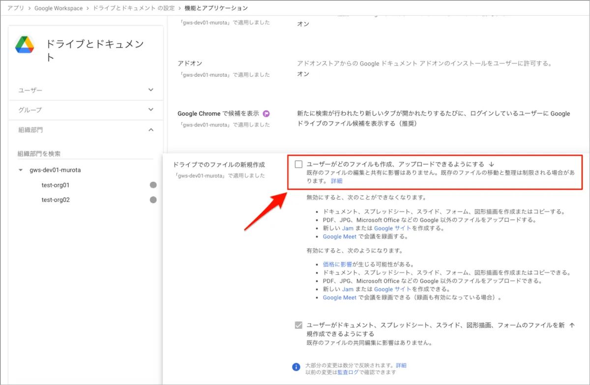 - 詳細は以下ブログの「Google Driveに対する制限方法を変えて対応する」を参照ください