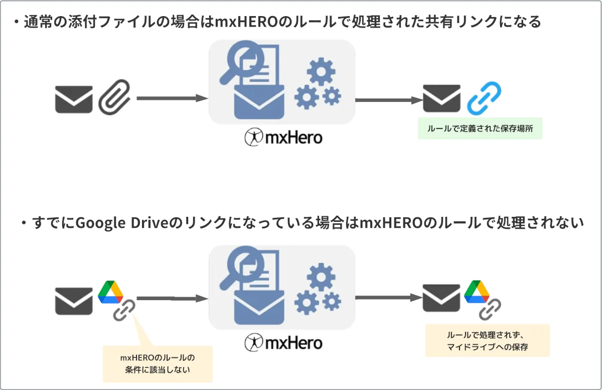 Google Driveの共有リンクとなった添付ファイルはmxHEROのルールの処理対象外となってしまいます。