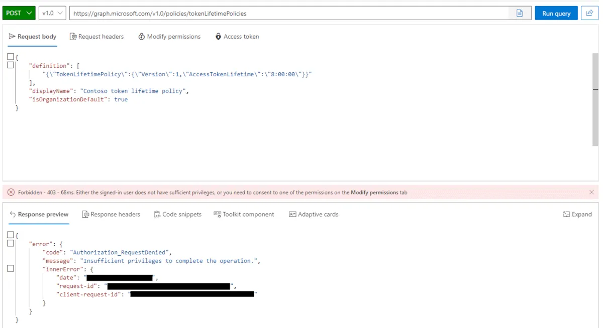 - Graph API では一部の操作を実行する際、Entra ID 上のロール情報を参照するケースがございます。グローバル管理者を持ったユーザーで再度お試しください。