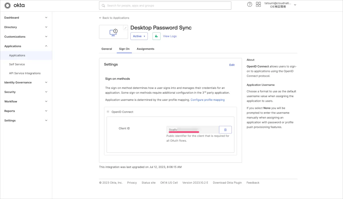 - Sign Onタブに表示されているClient IDをコピーしておきます。この値は次の工程であるJamf Pro側設定で利用します。