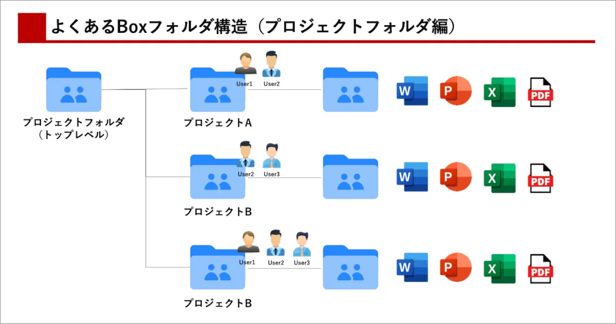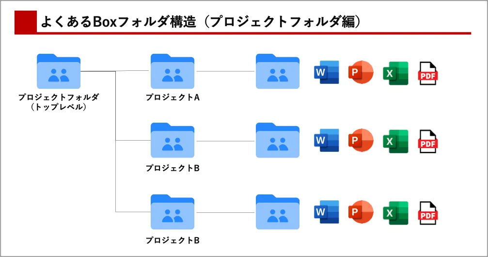 Boxのフォルダ設計のよくあるパターンとして、例えば各種プロジェクトに関する情報を格納するフォルダを作成する際、管理者は「プロジェクトフォルダ」というトップレベルフォルダを作成し、プロジェクトA、B、Cなどの下層フォルダを作成するのがよくあるパターンです。