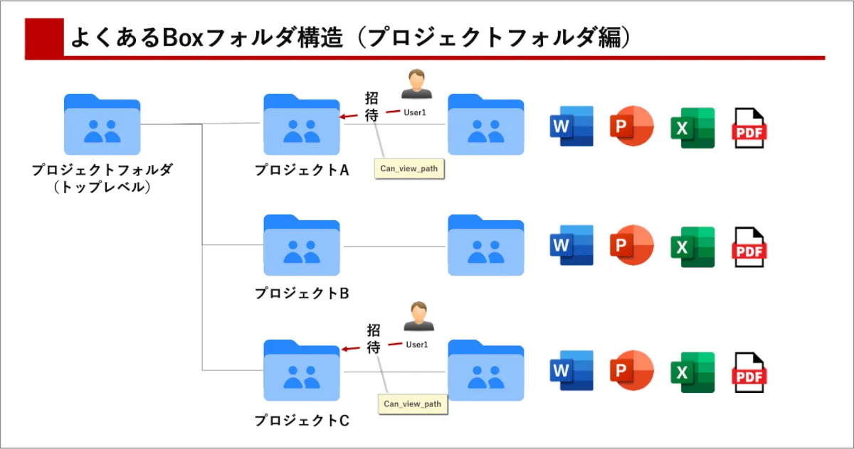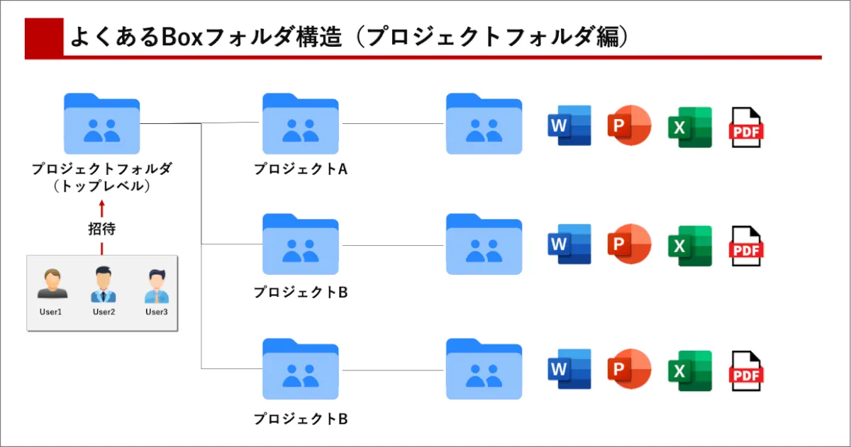 この場合において、可能であればトップレベルフォルダにユーザーやグループを招待し、下位のフォルダに対しては権限の継承でアクセスを許可するというスタイルがアクセス権限のメンテナンスや運用上好ましい形となります。ユーザーとしては[プロジェクトフォルダ] > [Aプロジェクト] という風にツリーを伝っていくことで目的の情報にアクセスできます。