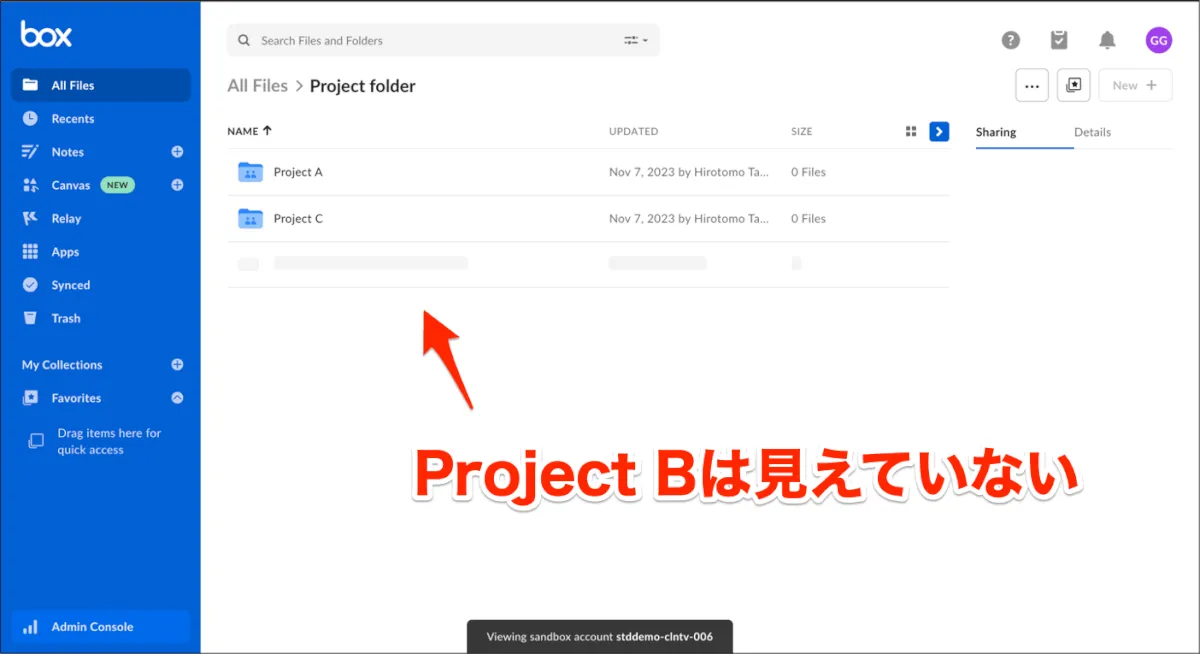 一方で、招待されたユーザー側でログインすると、トップレベルに「プロジェクトフォルダ」があるにも関わらず、1階層下の各プロジェクトフォルダには必要なものしかアクセス権限がないような動作となりました。