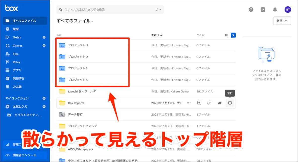 これを行うとユーザー目線では下記のイメージ画像のように、トップレベルに複数のプロジェクトフォルダが存在するように見えます。これはユーザーにとっては見にくいと感じるケースがあり、解消できないかとお客様から多くの相談を受けることがあります。