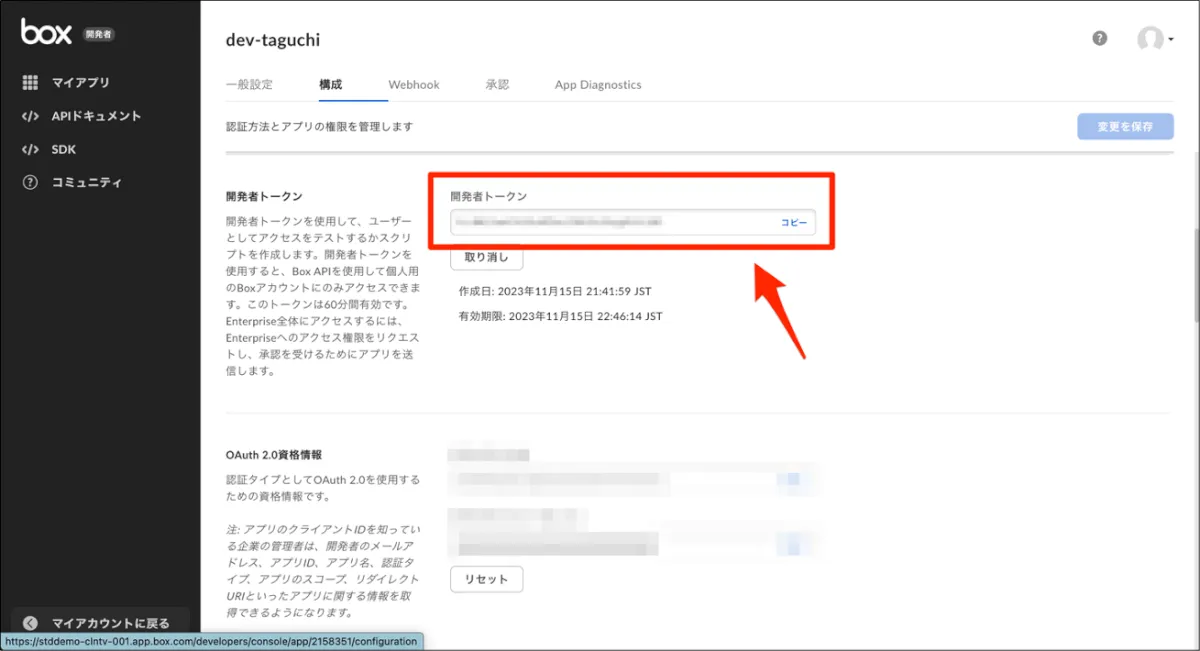 今回は簡易的な検証の立て付けなので、開発者トークン(60分で有効期限切れ)を利用します。開発者トークンは作成したアプリの[構成]にて取得します。