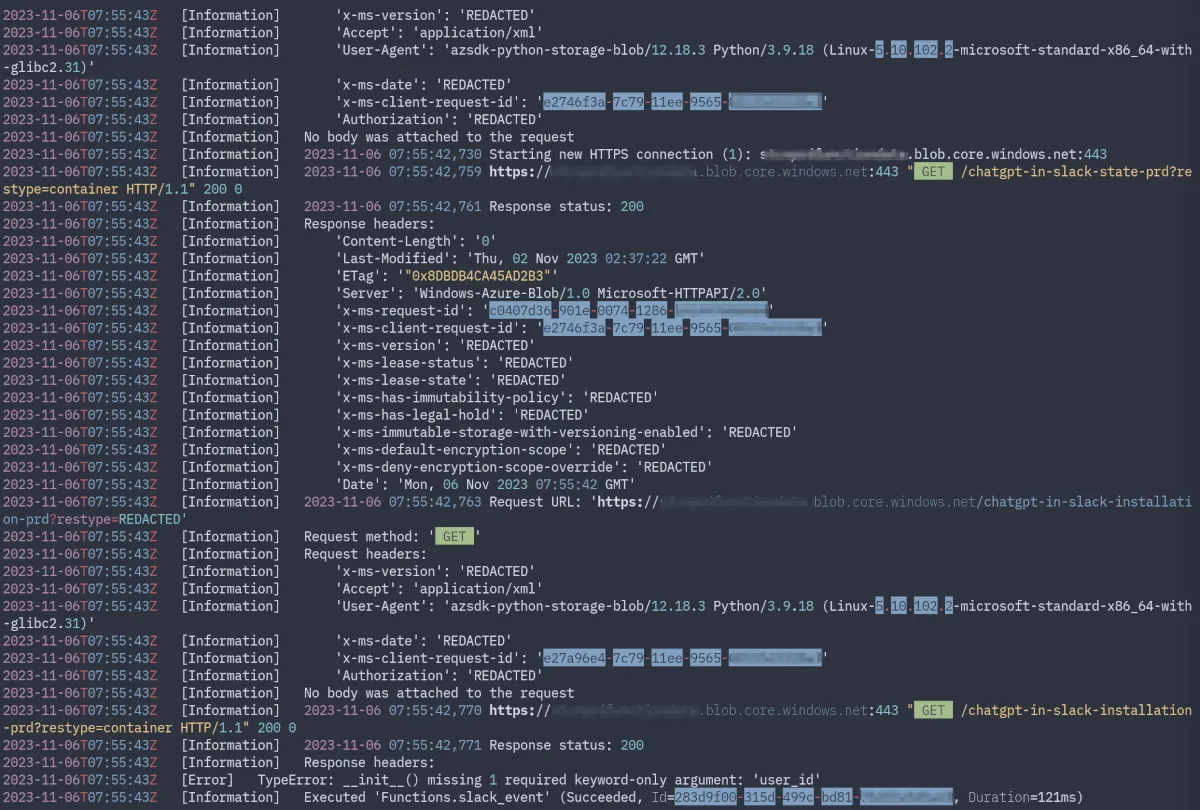 Slackの設定なのか、アプリの不具合なのかどこで不具合が発生しているのか不明だったので、とりあえずアプリのエラーを確認すべく、Azure Functionsのログを確認から調査を開始。