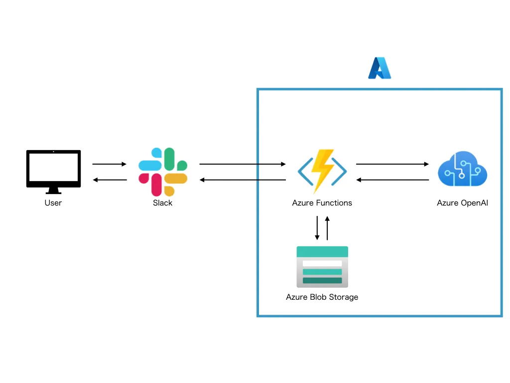 - seratch/ChatGPT-in-Slack をForkし、Azureインフラ(Azure OpenAI + Azure Functions + Azure Blob Storage)で動くよう改修したAI ChatbotをSlackにインストールして運用している