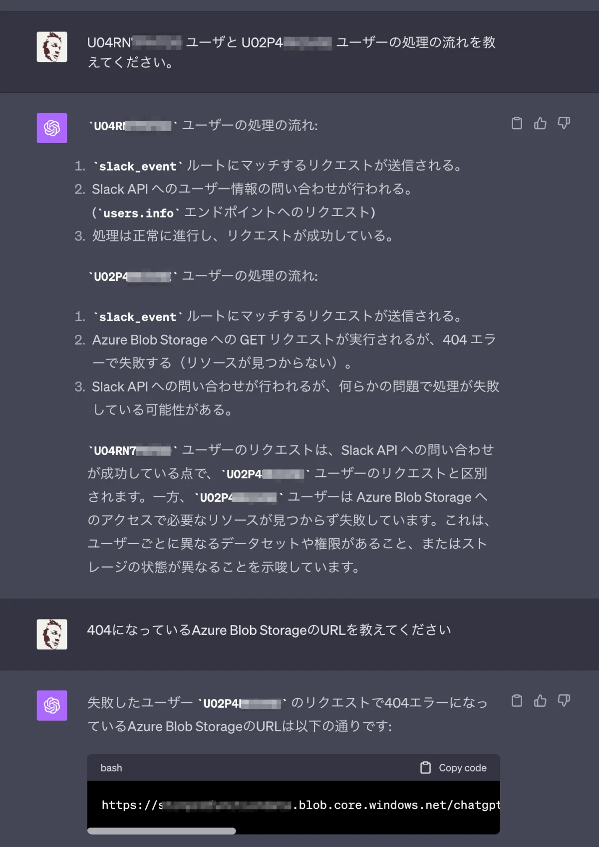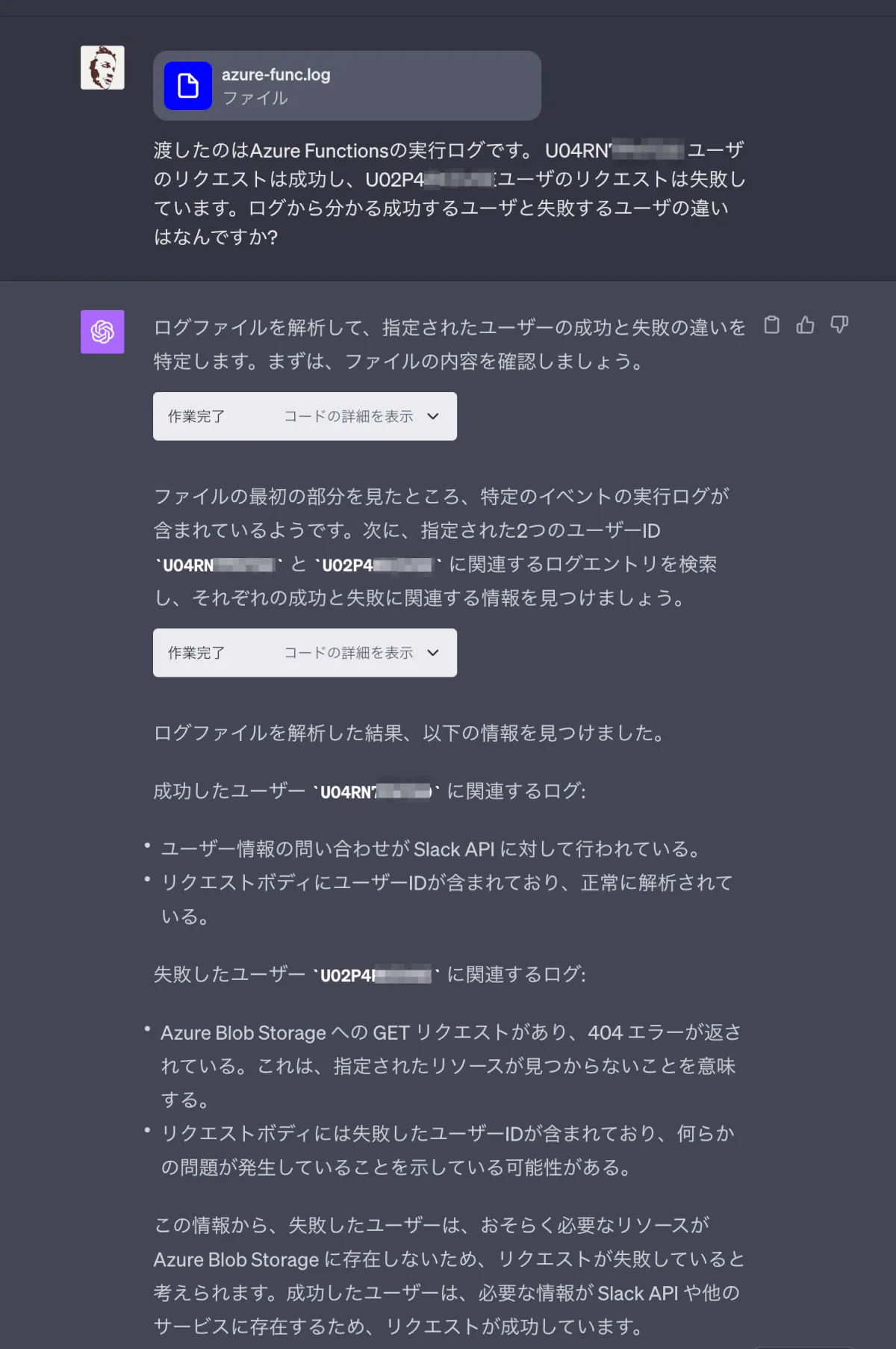 試しにアプリログをOpenAI ChatGPT(設定でオプトアウト済)を利用して調査をお願い。アプリログを渡し、プロンプトエンジニアリングを駆使し処理が成功するユーザと、失敗するユーザのSlack ID毎でログ分析を依頼。