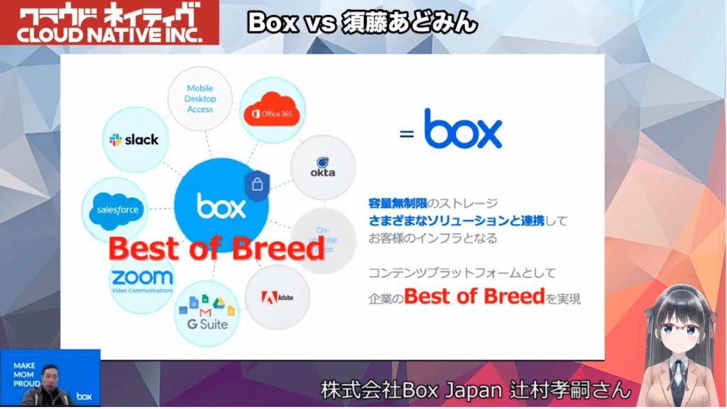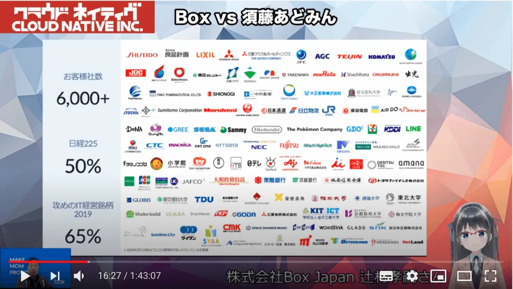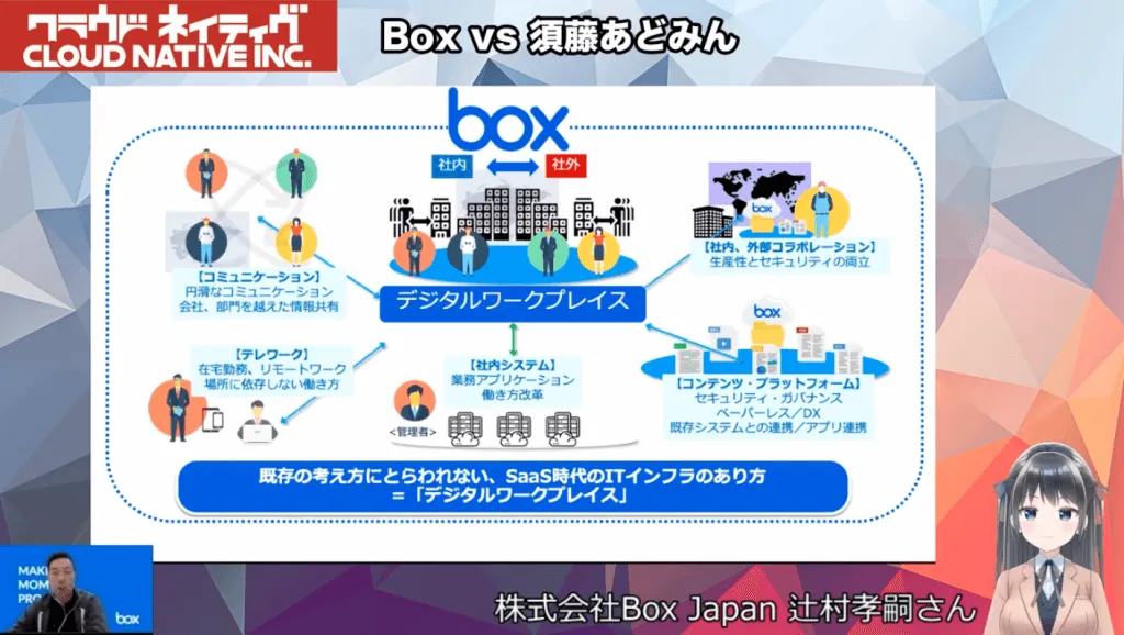 【追加情報(感想)】 冒頭に辻村さんがお話ししていた「会社の課題に向き合えば、必然的にクラウドとかSaaSにたどり着く」が正に、この配信を見終えた後にまたグッときました。かっこいいな・・・Box