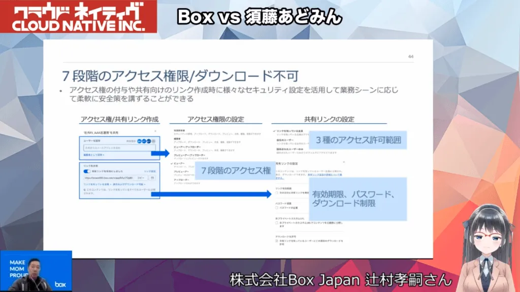 ID認証(SAML認証)、フォルダでは7段階(閲覧、編集、ダウンロード不可、など)のアクセス権限を使い分けすることが可能。Boxを利用することで、社内・社外・個人で扱うものを同じプラットフォームで管理できるのもアドバンテージ。