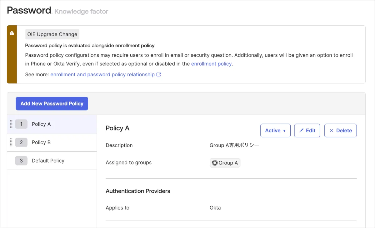 まずPassword Policyの設定はAuthenticators>PasswordのEditから行うことができます。