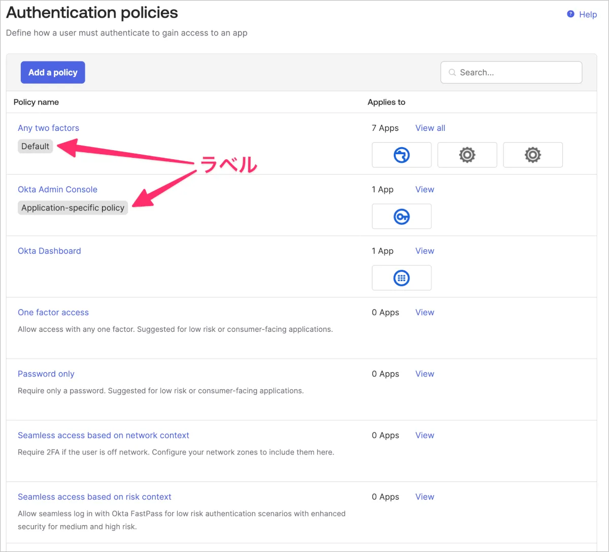 一言で言ってしまうとOktaに追加したアプリケーション(SP)の認証方針を設定します。
