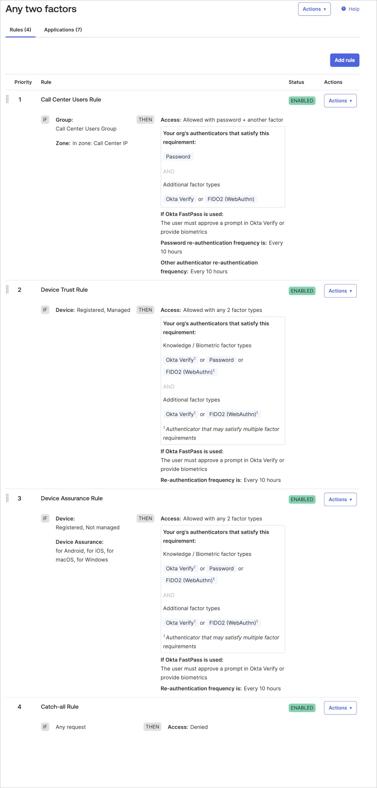 以下では、よくあるユースケースとしてOkta Verifyが利用できずFIDO2(WebAuthn)なら利用できるコールセンターのユーザーが一部存在することを考慮した設計としました。上から順番にCall Center Users Rule、Device Trust Rule、Device Assurance Rule、そしてCatch-all Ruleの構成としています。