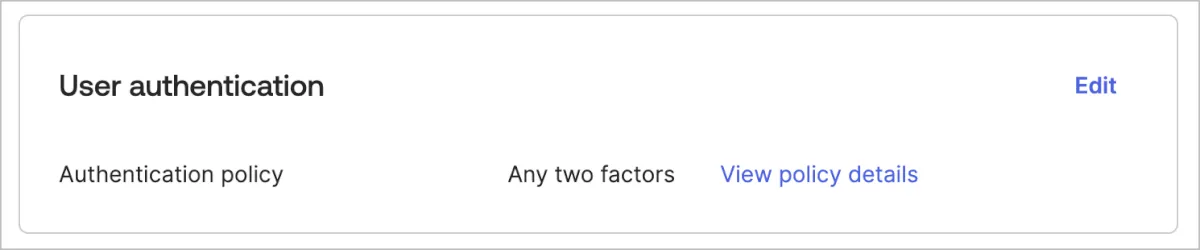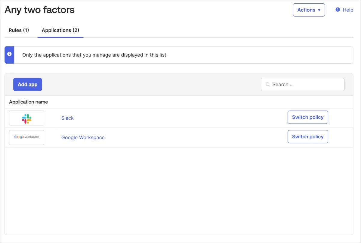 基本的にDefaultラベルが付いているポリシー名Any two factorsをメインのポリシーとし作成します。アプリケーション(SP)レベルでポリシーを分けたい場合は別のポリシーを作成するのがよいでしょう。